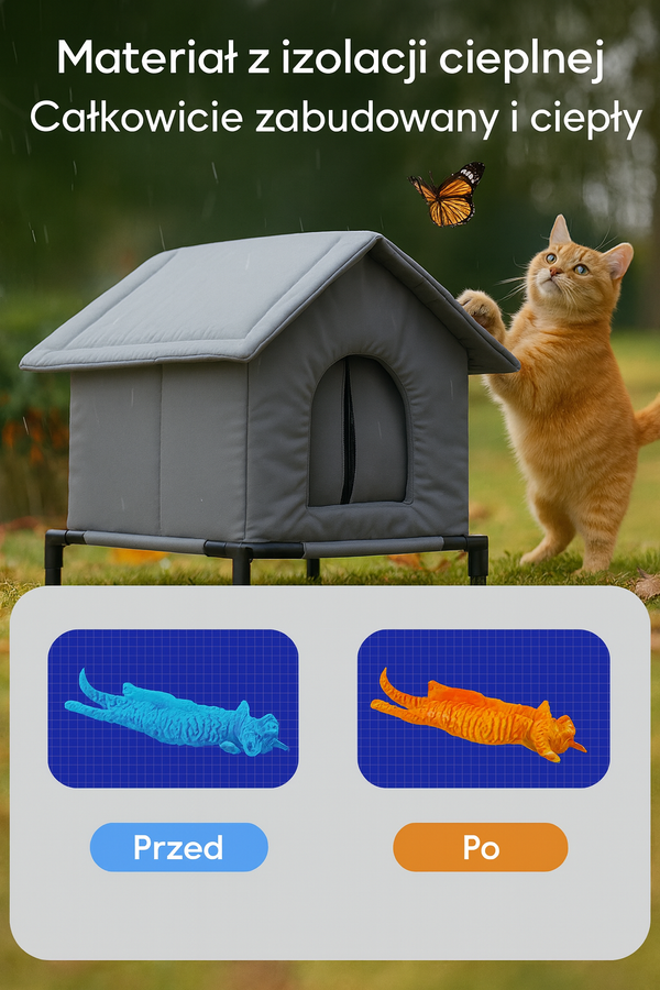 Termiczna izolacja utrzymuje ciepło wewnątrz domku, więc pupil nie marznie podczas mrozów. Wyobraź sobie kota śpiącego suchy i przytulny po zimowej nocy.